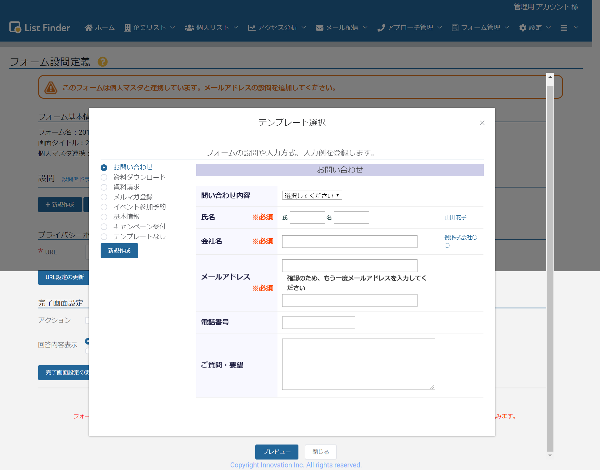 ・各種テンプレートを用意(お問い合わせ、資料ダウンロード、メルマガ登録等)