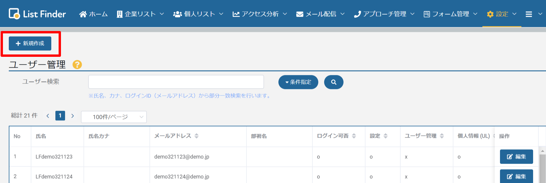 「+新規作成」をクリックして追加ユーザーの情報を登録します。