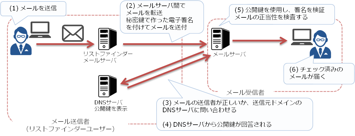 秘密鍵を使用してドメインの送信メールのヘッダを暗号化し、公開鍵をドメインのDNSレコードに追加します。受信サーバは、公開鍵を取得してメールのヘッダを復号化し、メッセージが本当にそのドメインからのものであること、途中で変更されていないことを確認できるという仕組みです。