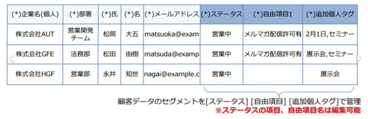 ※CSVファイルの項目名(例:(*)メールアドレス)は変更しないで下さい。