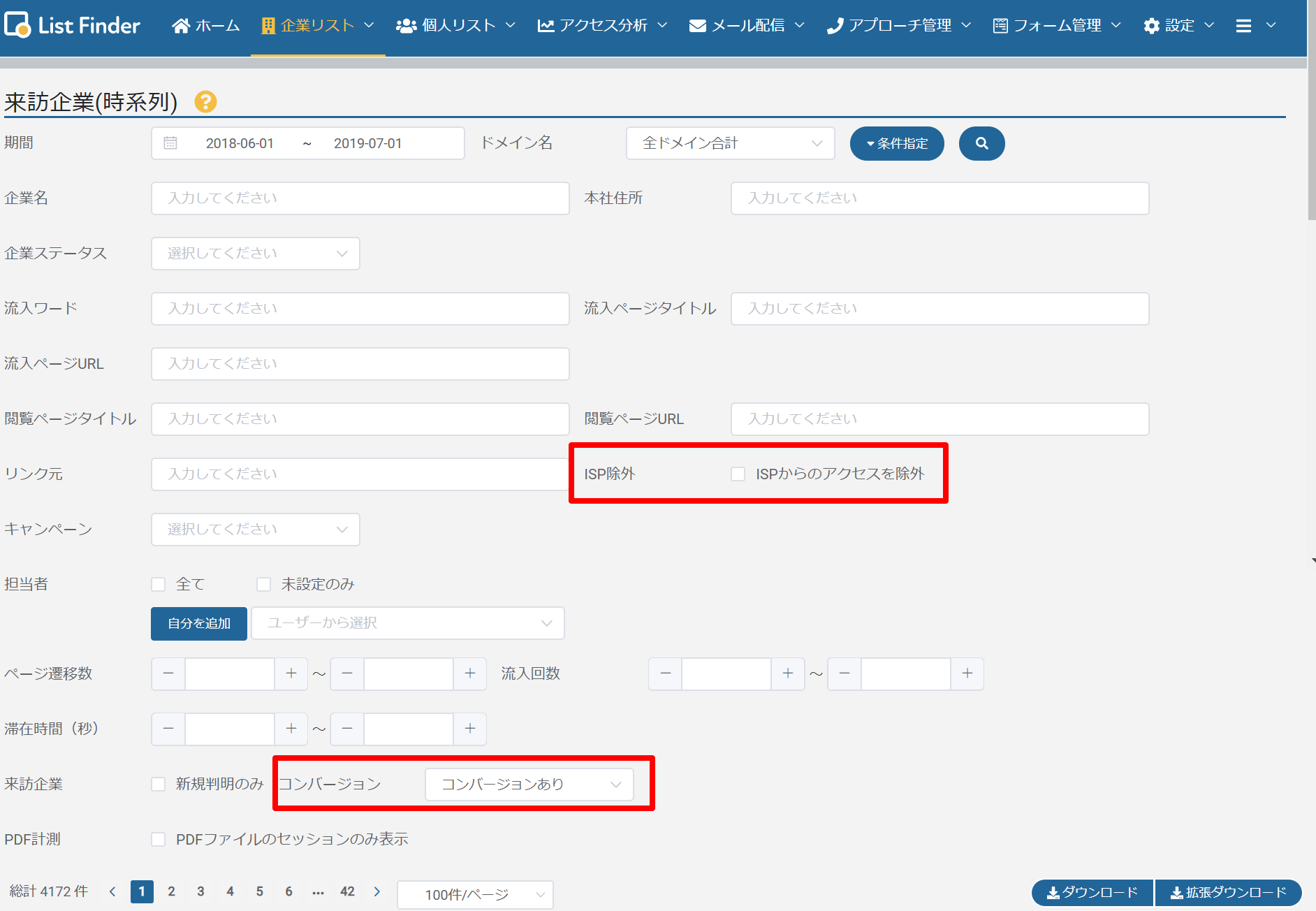 ※[来訪企業(時系列)]画面にて、企業名が判明していないインターネットサービスプロバイダ(ISP)経由のアクセスを表示させたい場合は、「ISP除外:☑ISPからのアクセスを非表示」 のチェックを外してください。