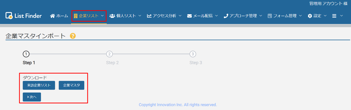 ①[企業リスト] >[企業マスタインポート]をクリックし、CSVファイルをダウンロード