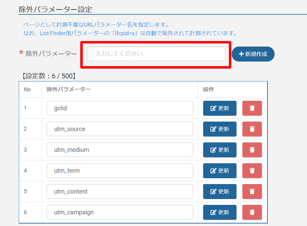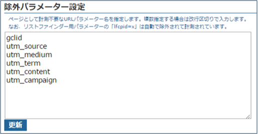 [設定][計測除外設定]画面で、除外したいパラメーターを改行区切りで入力後[更新]