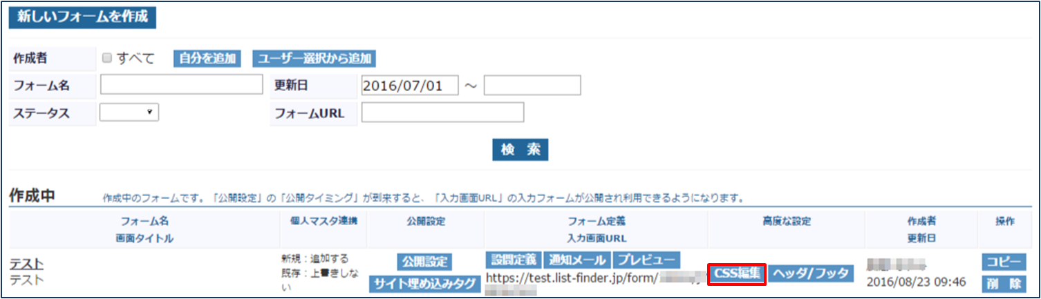 【フォーム一覧】画面より編集したいフォーム[高度な設定]の[CSS編集]ボタンをクリックし、スタイルシート画面にてCSSを記述することで変更が可能です。